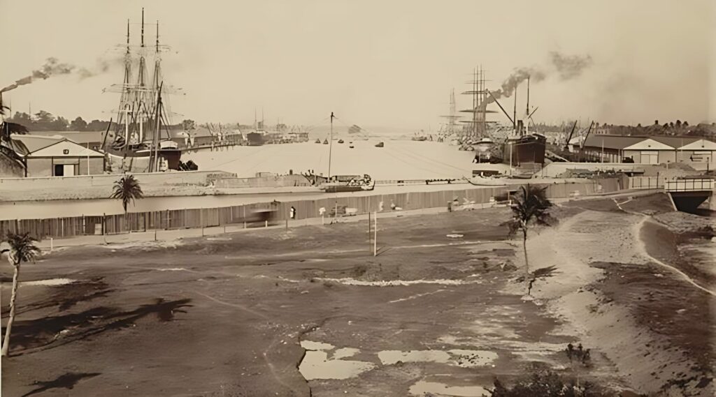 উদ্বোধন হয় খিদিরপুর ডক-I-এর... ব্রিটিশ স্কুনার ‘লুইজ’ প্রথম জাহাজ হিসেবে প্রবেশ করে...হাজারো মানুষের উল্লাস...জাহাজের পাল খোল... এবং হুগলির জলে তার প্রতিফলিত আলো।