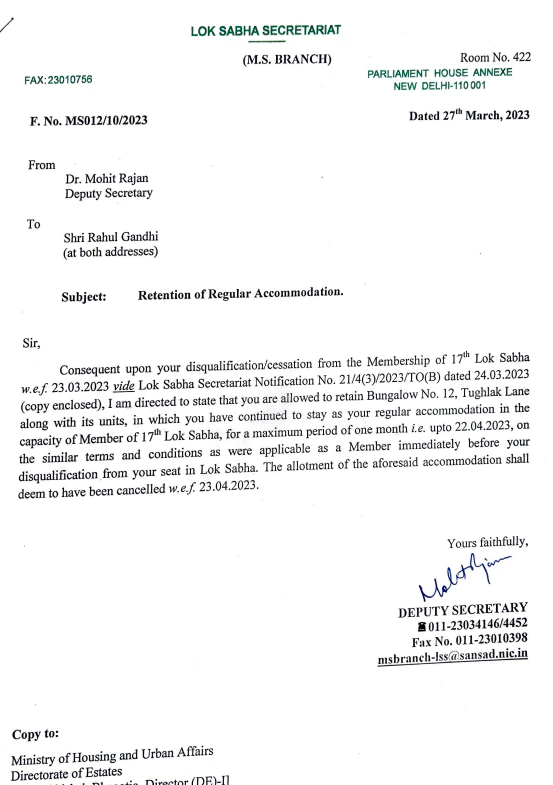 গত সপ্তাহে, লোকসভা সচিবালয় কংগ্রেস নেতা রাহুলকে সাংসদ হিসাবে অযোগ্য ঘোষণা করে। ২০১৯ সালের একটি ফৌজদারি মানহানির মামলায় সুরাটের এক আদালত রাহুলকে দুই বছরের কারাদণ্ডে দণ্ডিত করে। তার জেরেই ২৩ মার্চ থেকে রাহুল গান্ধির সাংসদ পদ খারিজ করে দেওয়া হয় ।