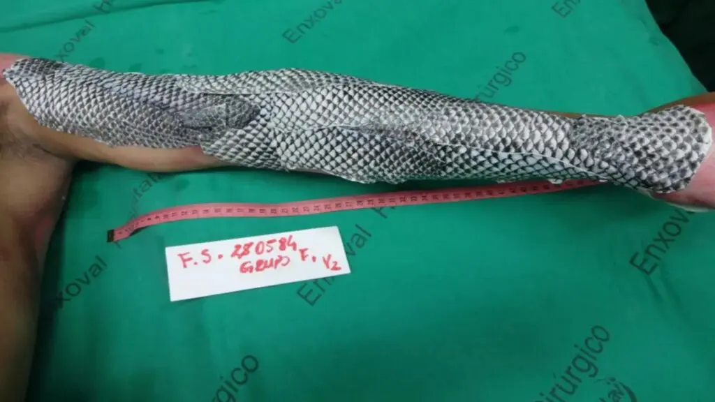 গবেষণায় এক ২৩ বছর-বয়সী ব্যক্তির ঘটনা বর্ণনা করা হয়েছে। বাহু, মুখ এবং দেহের বিশাল অংশ পুড়ে যায় তাঁর। নীল নদের তেলাপিয়া মাছের চামড়া ব্যবহার করে তাঁর চামড়ার হাল ফেরানো হয়। প্রথমেই, ব্যাকটেরিয়া এবং ছত্রাকের পরীক্ষা করার আগে তেলাপিয়ার ত্বককে রাসায়নিকভাবে জীবাণুমুক্ত করা হয়েছিল, গ্লিসারোল দিয়ে পরিষ্কার করা হয় এবং সংক্রমণের ঝুঁকি কমাতে ফ্রিজে রাখা হয়।